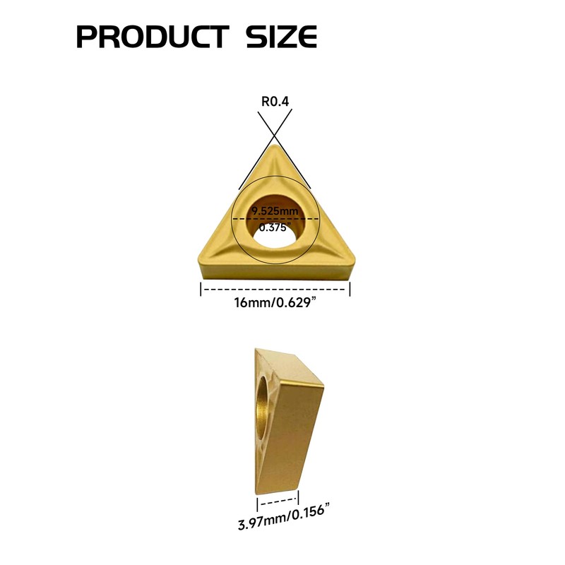 - 【Carbide Inserts Size】Blade length: 16mm/0.63", Thickness: 4mm/0.157", Outer diameter: 9.525mm/0.375", Inner diameter: 5mm/0.197", R=0.4mm(1/64")