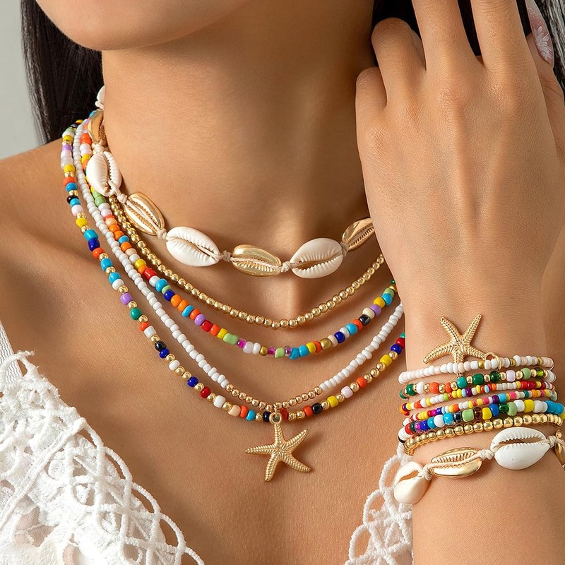 - Boho Schmuckset Komplett: Sie erhalten ein mehrlagiges Halsketten Set mit echten Muscheln bunten Perlen und Seestern Anhänger sowie ein passendes mehrteiliges Muschel Armband Set perfekt für den angesagten Lagenlook