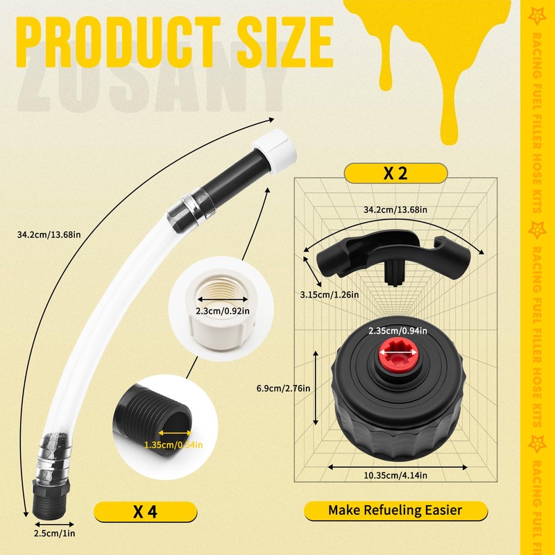 - Functional Design:Our fuel bottle caps and racing fuel jug hose are a great combination. 5 gallon caps increase pouring area, 2 iron hoops make fuel less likely to leak, filters are designed to keep debris out of the fuel tank, and a hose bender bends and secures the hose to the optimal angle for faster and easier