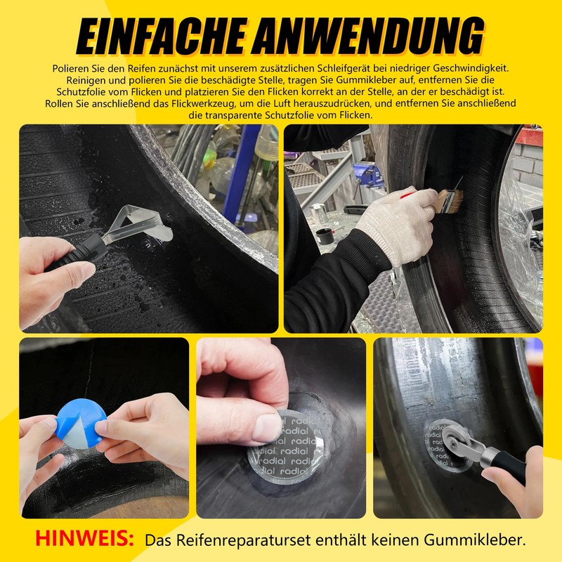 - Einfache Anwendung: Reinigen und polieren Sie zunächst den beschädigten Teil des Reifens. Tragen Sie anschließend Klebstoff auf, entfernen Sie die Folie, kleben Sie das Reifenflicken auf und verwenden Sie das Flickenwerkzeug zum Rollen. Die einfache Handhabung spart Zeit und Kraft. (Hinweis: Das Reifenflicken-Set enthält keinen Gummikleber.)