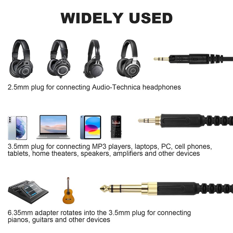 - WIDELY USED: 2.5mm plug to connect Audio-Technica headphones.3.5mm plug or 6.35mm plug to connect MP3 players, laptops, PCs, cell phones, tablets, home theaters, speakers, amplifiers, and other devices.6.35mm adapter can be rotated into the 3.5mm plug to connect pianos, guitars, and other devices.