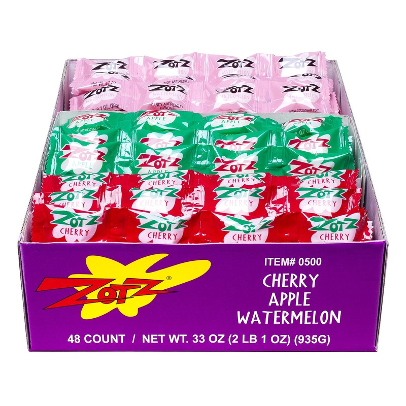 - Variety of Flavors. Zotz comes in assorted fruit flavors like cherry, watermelon, strawberry, blue raspberry, apple, orange, and grape. We've also come up with a fiery cinnamon flavor for those who want a bit of heat in their candies.
