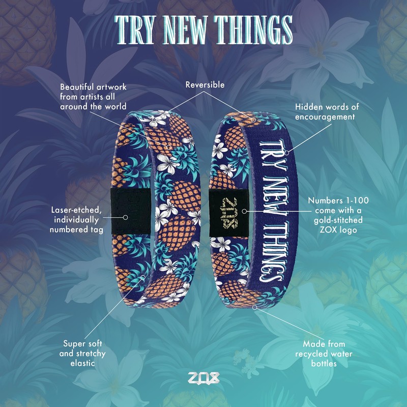ZOX Bracelets — Try New Things | Stretchy Elastic Band with Motivational Affirmations and Beautiful Artwork, Great Wristband Gift for Men, Women, and Kids (Large)