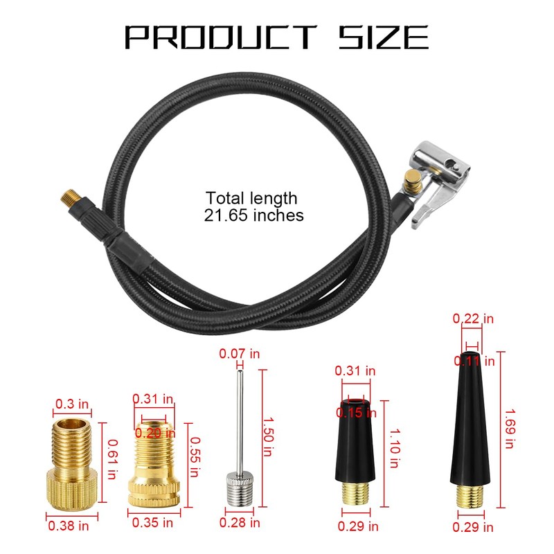 Package Include: 1 tire inflator extension tube, 1 presta valve adapter, 1 ball needle adapter, 2 tapered nozzles