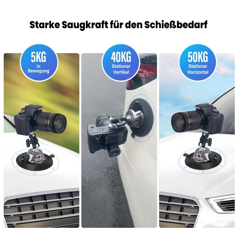 - Strong and stable suction power: 15 cm/6 inch camera suction cup holder is made of aluminium alloy thread block and rubber, strong corrosion-resistant aluminium alloy can withstand unsafe outdoor environments, natural rubber is thick and wear-resistant, good sealing performance and longer lasting suction power. The suction cup holder has a horizontal load capacity of 50 kg and a vertical load capacity of 40 kg, which meets the daily use of photography.