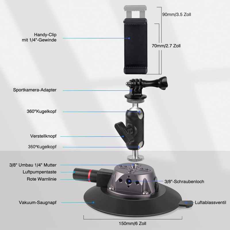 - 【Easy Installation】: Place the suction cup on a flat, smooth and non-porous surface; press the vacuum pump repeatedly until the red warning line disappears; install the magic arm and camera to start recording; pull the drain valve for quick release.