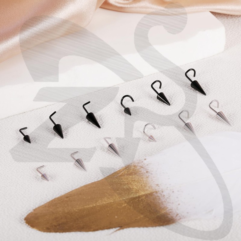 - Size of the nose stud in L shape — Thickness of the spike nose stud: 20 g (0.8 mm); nose ring bar length: 7 mm. Nose piercings ball/cone size: 6/8/10 mm. Be careful when using the long cone of the spike nose ring.