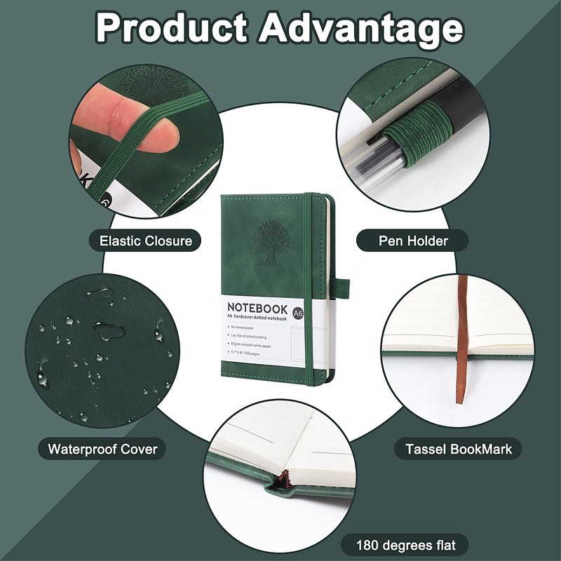 Journal Notebook Is Made Of 80 Grams Of Excellent-Quality Paper, Providing A Smooth Writing Experience Without Bleeding Ink. 7 Mm Line Spacing Design Makes The Handwriting Neat And Easy To Read. And Each Page With The Date At The Top, You Can Check Out The Day Of The Week. The Beige Paper Is Soft And Eye-Friendly, Making It Ideal For Taking Minutes Or Keeping A Travel Diary For Long Periods Of Time. Reinforced Binding Ensures Frequent Page Turns Without Unravelling. And It Spreads 180° For Easy Writing. Made Of Excellent-Quality PU leather With An Elegant Tree-Embossed Cover. The A6 Size Notebook Combines Durability With Artistic Aesthetics. The Embossed Textured Surface Is Scratch-Resistant And Develops A Distinctive Shine Over Time, Giving It An Even Greater Sense Of Texture The More You Use It. The Hard Cover Provides Solid Writing Support And The Rounded Corners Avoid Edge Wear And Fit The Curvature Of Your Palm For A Long Time Without Fatigue. It Is Easy To Carry, With An Elastic Strap To Minimize Page Breakage On The Go. A Pen Insert That Fits All Types Of Pens. And A Ribbon Bookmark To Quickly Locate Key Content. With A Lightweight Design Of Only 276 Grams. The Compact Size Fits Easily Into A Briefcase, Shoulder Bag Or Coat Pocket. Whether it's Business Shorthand, Classroom Notes, or Watercolour Doodles. This Notebook Is A Fine Balance Of Practicality And Aesthetics That Will Make Every Record Clearer And More Efficient