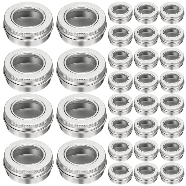 Zubebe 50 Pcs Aluminum Tin Jar Refillable Containers Clear Top Screw Lid Round Tin Container Bottle for Cosmetic, Cream, Diamond Painting, Salves, Balms, Lip Balm, Spices or Others, Silver (1 oz)
