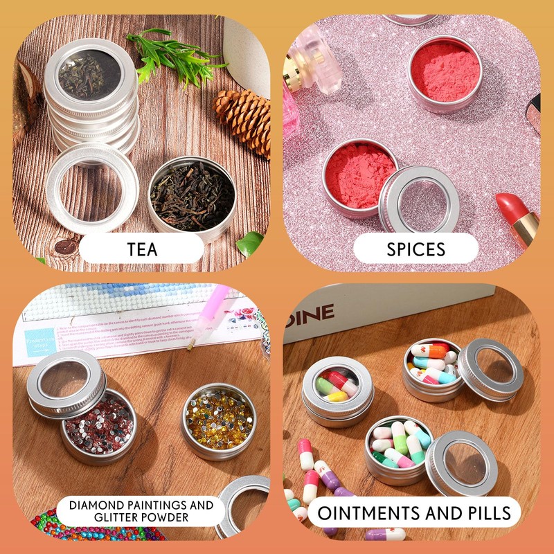 - Clear Top for Distinguishing: the small tin has clear screw top, and you do not have to open the lid to find what you need, you can check the insider through the clear cover; And the screw cap of the container has round edge, which can prevent your hands from scratching