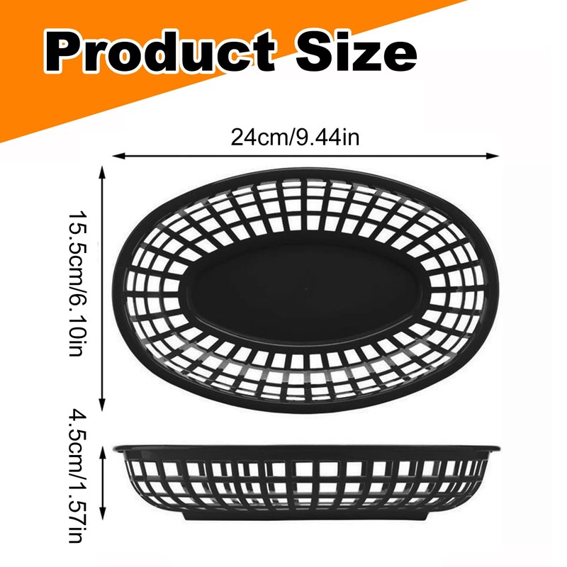 - Product Size: oval fruit and vegetable fries basket, L*W*H: 9.45*6.10*1.77inch, total 4pcs, 2 colours to choose from: white and black