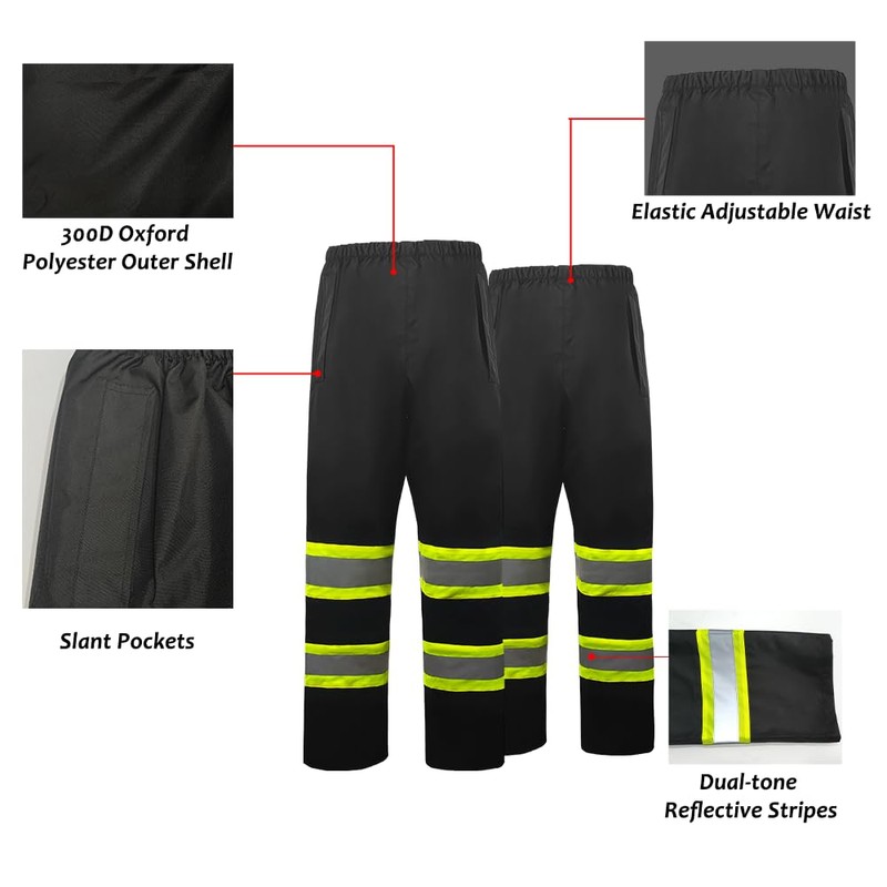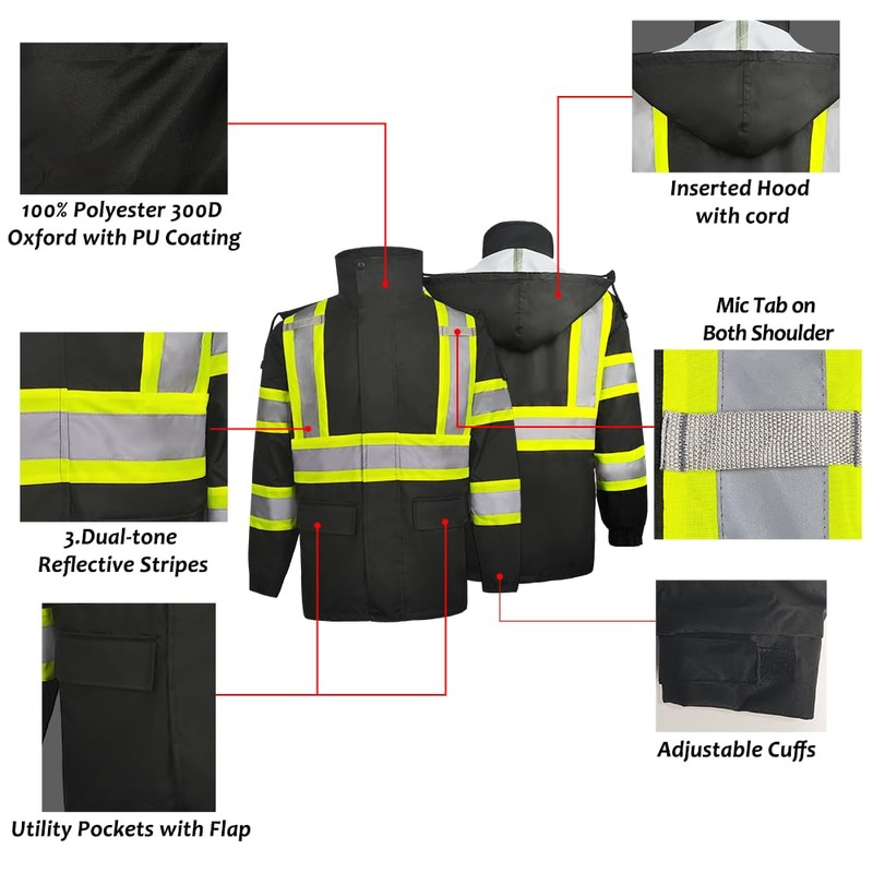 ZUJA High Visibility Safety Jacket and Pants ANSI/ISEA Standard Reflective Jacket Pocket and Zipper(Black Rain Suit,M)