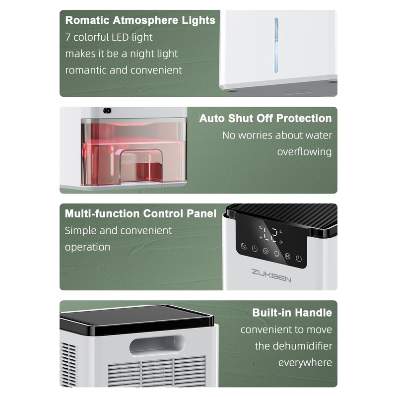 • SMART CONTROL DEHUMIDIFIER :2025 newly upgraded home dehumidifiers features a user-friendly LCD touch panel with on/off button,dual dehumid modes,7 lighting options,smart humidity lock,timer,and sleep mode.The clear display simplifies operation for all user.Includes a see-through water tank with a grooved design for real-time monitoring and effortless maintenance removal/cleaning