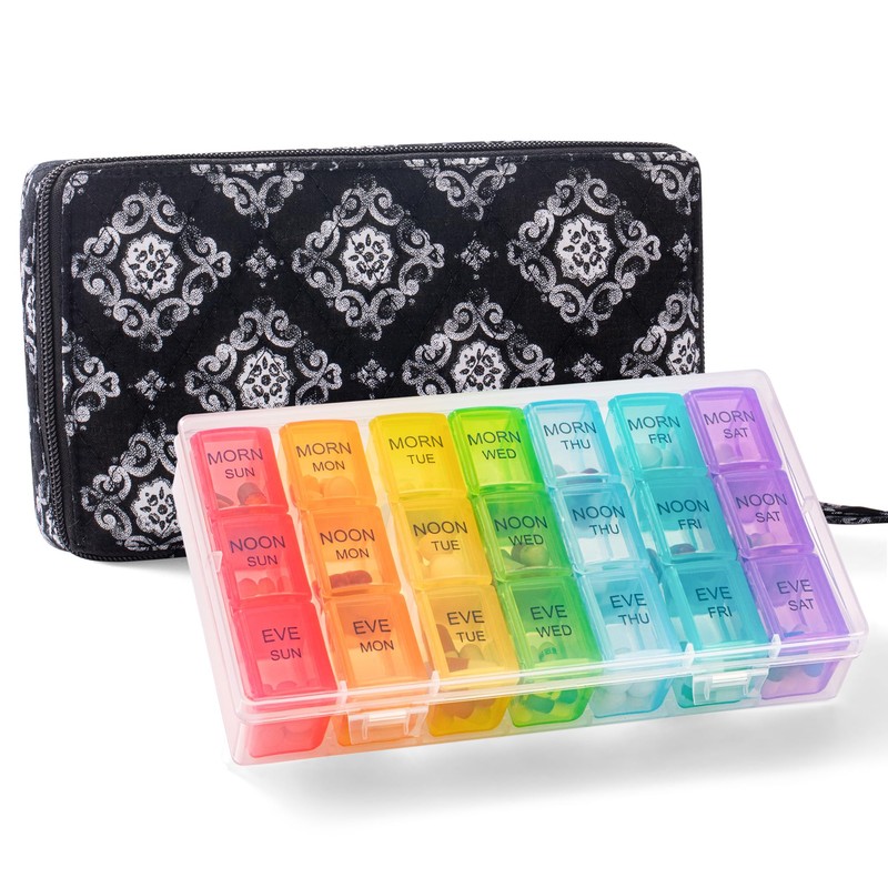 Zumd Weekly Pill Organizer 3 Times a Day - Pill Box 7 Day 3 Times a Day with Cute Quilted Fabric Zipper Bag- Travel Pill Case 7 Day 3 Times a Day for Vitamin Medicine Organizer