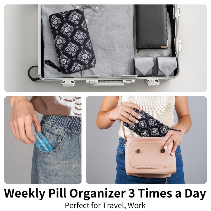 - Quilted Design: Pill containers 7 day 3 times a day elegant Quilted Floral Cotton design, soft and elegant texture, daily use, good privacy for the pill box, designed with a card clip, you can store RFID or prescriptions, matching combination suitable for travel or business trips