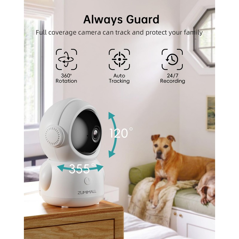 ZUMIMALL Security Camera Indoor, 5G/2.4G WiFi Baby Monitor with Camera and Audio, 2K Wired Pet Camera for Home Security, One-Click Call, Auto Tracking, Cry/PIR/AI Detection, Alexa/ONVIF/Cloud