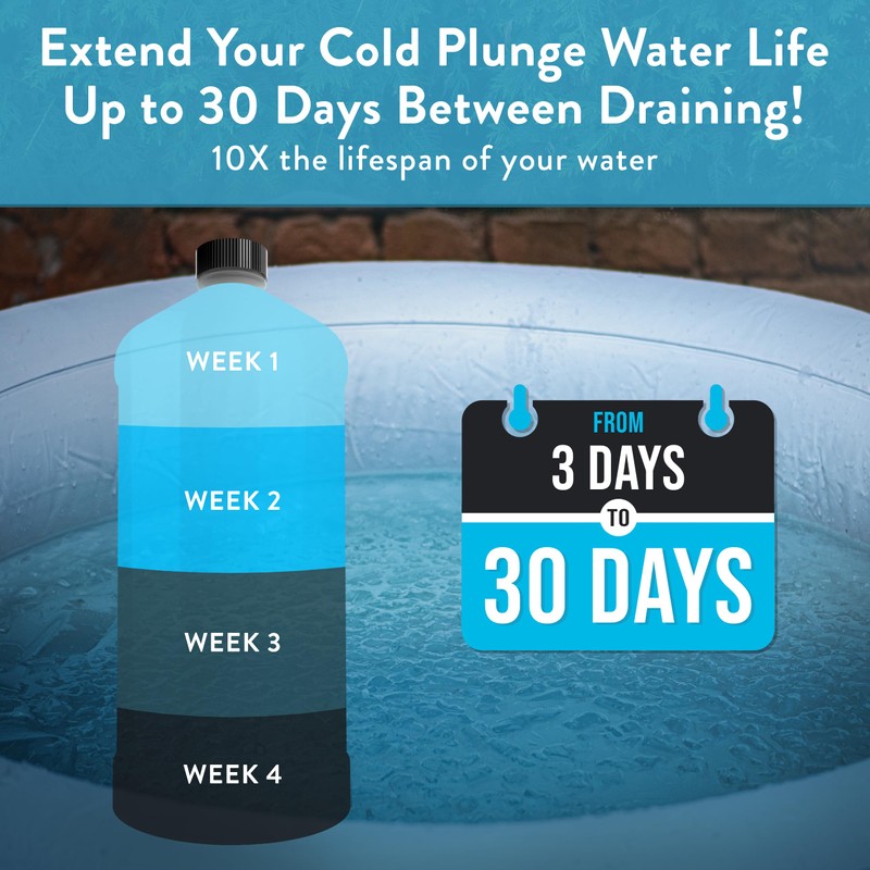 - LONG-LASTING COLD ICE PLUNGE WATER PURIFIER: Add directly into tub at a rate of 8oz (1/4th bottle) per 100 gallons of water each week of our proprietary HOCl cold plunge cleaning solution maintains crystal-clear water for up to 4 weeks, significantly reducing the need for frequent draining and refilling. Ideal for ice bath enthusiasts looking to extend the lifespan of their cold plunge water.