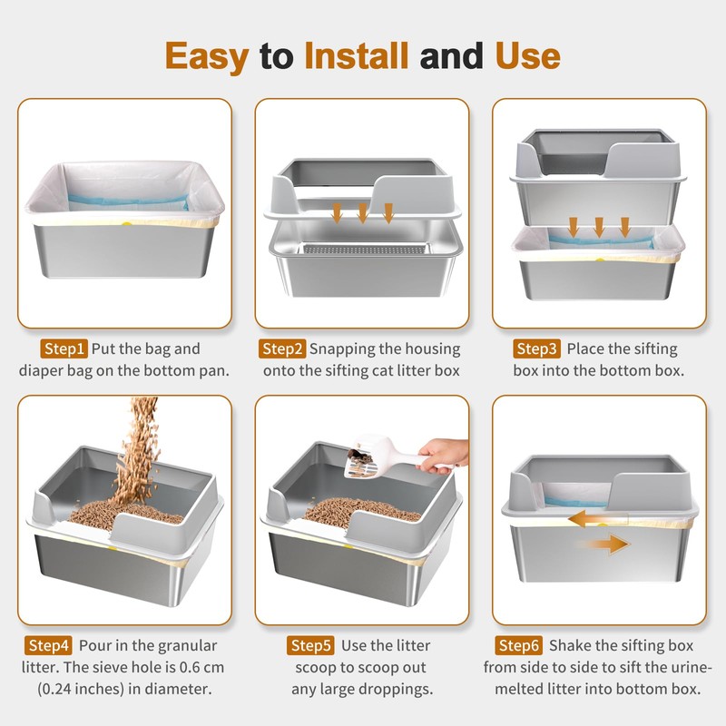 • Designed for Pine Pellet Cat Litter: This stainless steel litter box with lid contains a sifting litter box designed for pine pellet cat litter which , the diameter of the round sieve hole is approximately 0.2 inches, pine litter absorbs urine and turns into sawdust, and shaking the sifting litter box sifts the sawdust into the bottom box which comes with litter box liners and pee pads for easy cleaning.
