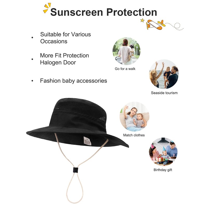 - Gorro de sol transpirable para bebé: el sombrero de sol para bebé está hecho de materiales de alta calidad. Hay un diseño de malla en el medio del cubeta del sombrero, que es cómodo y transpirable, y puede evitar eficazmente que el bebé sude.