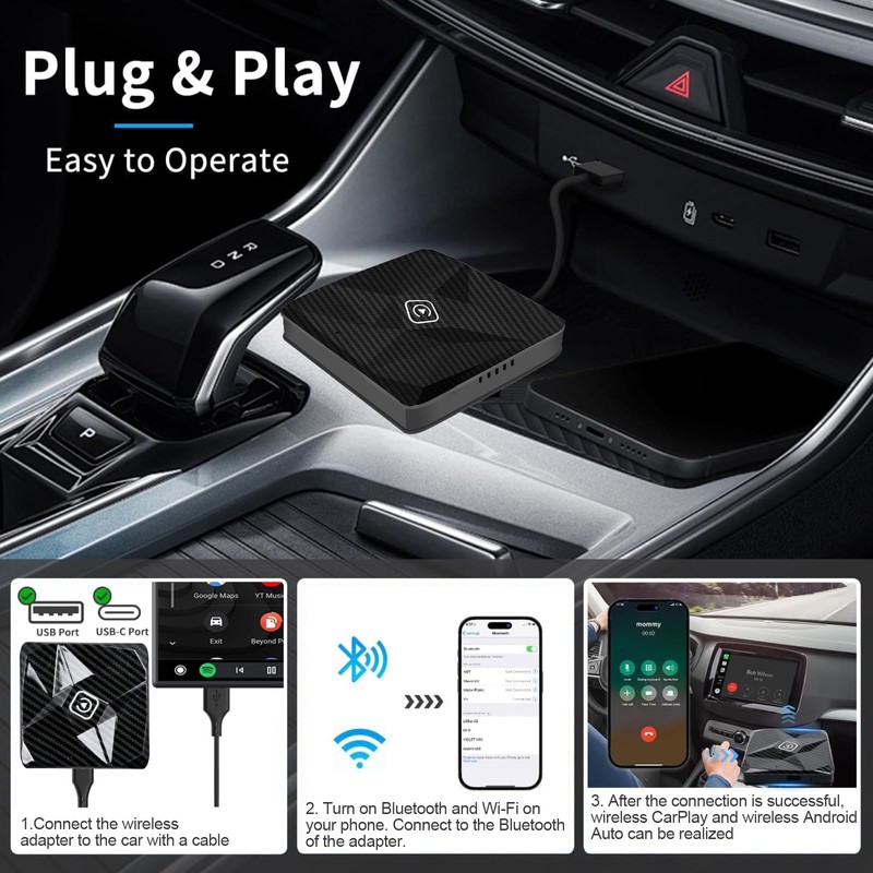 - 【Wireless CarPlay Adapter】Convert your wired CarPlay & Android Auto system into a wireless system with this wireless Apple CarPlay adapter & wireless Android Auto adapter. Stay connected and enjoy a smooth driving experience with continuous wireless connectivity. Forget about disconnections—easily access calls, messages, music, navigation, and Siri, all without the need for constant cables.