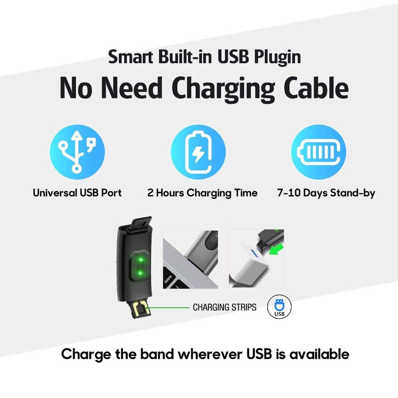 - Fast & Easy Charging: Built-in USB plug and long battery life, 1-2 hours full charge gives you up to 7-day working time. No messy cables needed, just take the band off from the tracker host and charge it wherever there is a USB port.