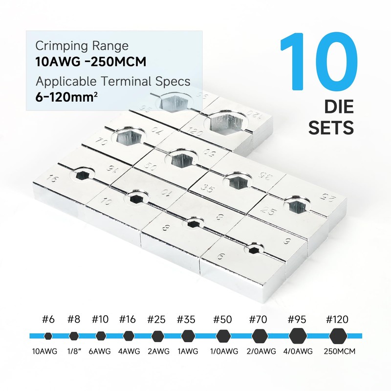 - Include Items: This crimping tool includes 10 pairs of US standard chromed hexagonal dies (10AWG, 1/8”, 8AWG, 6AWG, 4AWG, 2AWG, 1/0AWG, 2/0AWG, 4/0AWG, 250MCM) provides precise crimping; come with a pair of gloves