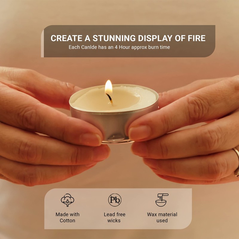 - ???????? ???????? ?????? ???????????? ??????????: Our 4 hour tea lights candles are made with high-quality lead-free cotton wicks. This allows the tea light to burn for 4 hours straight without any problem. These 50 pack t lights set is very efficient for burning without producing smoke