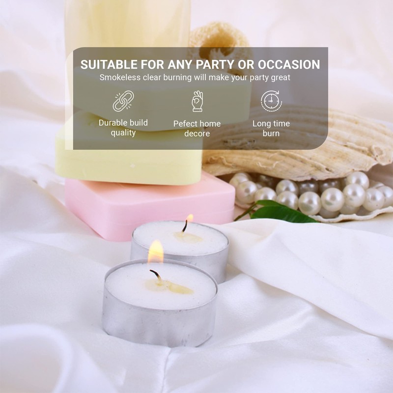 - ???????? ?????? ???????????????? ????????????: Our tea light candles have a 4hr tealights unscented candes burning period is perfect for weddings, parties, and restaurants to provide an ambient environment with our Zuvo tea light candles 50 pack set