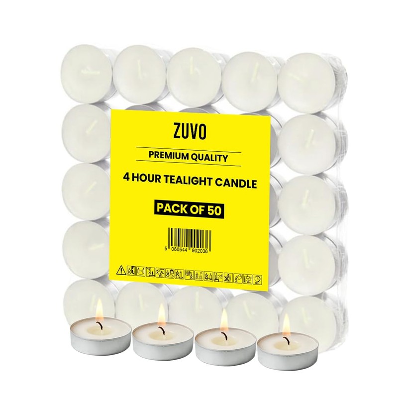 - ???????? ???????? ????????: Our 4 hour tealights 50 pack candles provide a long-lasting lighting environment. The Zuvo tea light candles are small in shape and have a bright flame. These 4 hour tea lights are perfect for all events