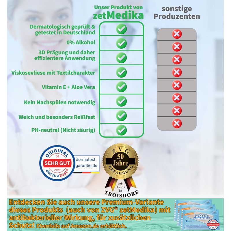 - pH neutral, perfume-free, heatable: the cleaning fluid with which the wet washing gloves are soaked are pH neutral (not acid) and fragrance-free so that sensitive skin can be pleasantly cared for. The washing gloves can be heated in the microwave (max. 600 W for 20-25 seconds. ).