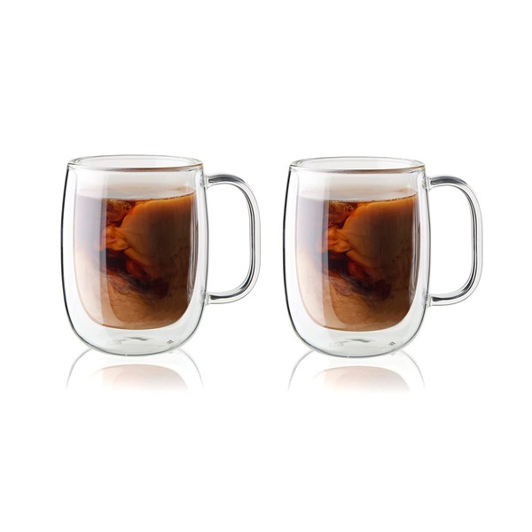 - With two double-walled glasses, you can serve hot and cold drinks in a stylish way. In these glasses you can serve latte, lemon tea, iced coffee, lemonade, chilled juices and colourful drinks. The double base and double walls keep the temperature of the drink for a long time and protect your hands from burns. The glass tableware looks elegant. The simple shape adapts to different kitchen settings.