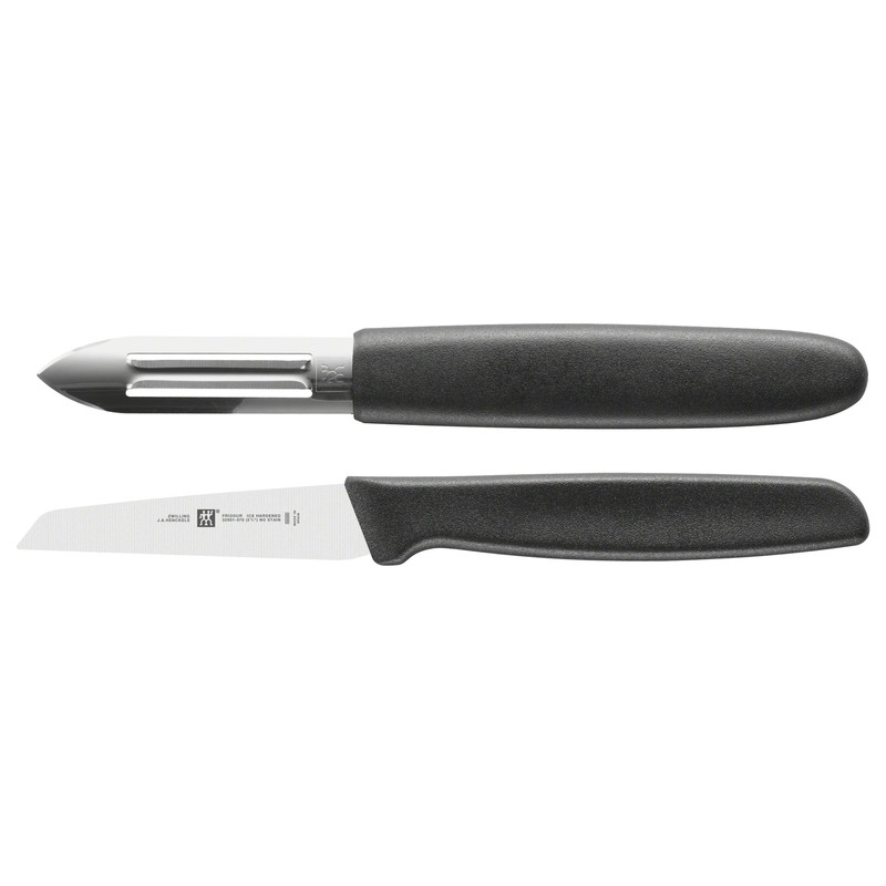 - Box contents: 1 x Zwilling knife set, 2 pieces, Twin Grip, contents: 1 peeler (6.5 cm), 1 vegetable knife (7 cm), material: stainless steel/plastic handles, 1002317