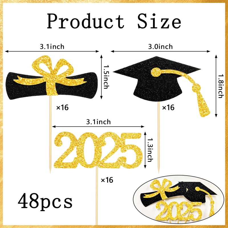 - 【Graduation Cupcake Picks】You will receive 48pcs 2025 graduation cupcake toppers,include 16pcs 2025 picks,16pcs graduation cap picks,16pcs diploma picks.A total of 48 pieces,ample quantity can meet your different decoration needs and make your graduation party decorations stand out.Our glitter class of 2025 cupcake toppers could add more fun to your graduation party decorations.Enjoy the party with your guests with the cupcake toppers in the graduation party day.