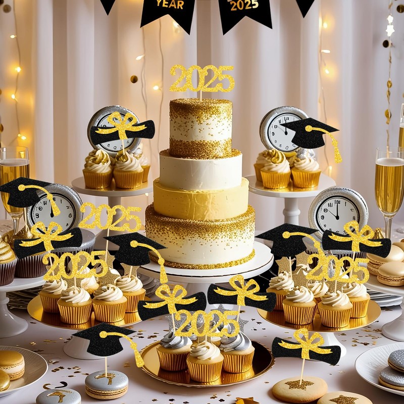 - 【Graduation Cupcakes】These graduation party cupcakes design features black and gold glitter graduation themed,looked elegant and festive.They have multiple graduation elements,including glittery “2025” design,along with the cute graduation cap and diploma toppers,which are the great touch for our Class of 2025.The congrats grad graduation cake decorations will amp up your graduation pastry arrangements.