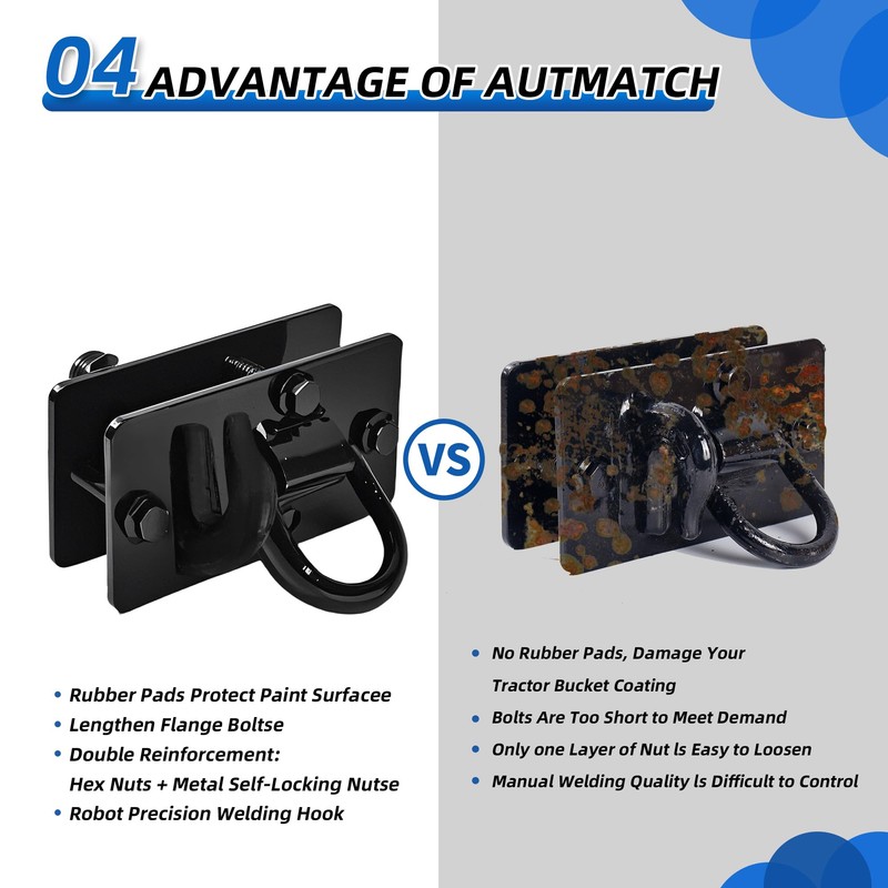 • Integrated Design for Enhanced Performance:Our Tractor Bucket Grab Hook boasts a unique design where hooks and D Rings are seamlessly integrated onto a single plate, enhancing overall working performance. Strategically placed at the front end of the tractor, these hooks excel in dragging tasks, providing a reliable solution for heavy-duty operations. Additionally, they ensure the tractor remains firmly fixed during transit, offering peace of mind and security. This innovative design simplifies your work, making it more efficient and safe.