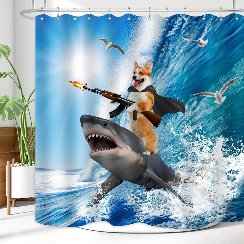 ZXMBF Funny Dog Corgi Riding Shark Shower Curtain Ocean Sea Waves Seagull Animal Surfing for Kids Boy Men Hilarious Fun Waterproof Fabric Bathroom Decor 72Lx72W Inch with 12PCS Plastic Hooks