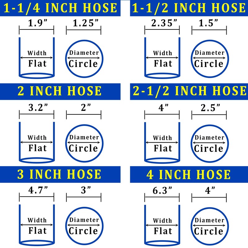 - 1 1/2 in Diameter & 2.35 inch Width: This is the standard size backwash hose. The 1-1/2” refers to the inside diameter of the hose, meaning it can connect any pump / pipe outlet up to 1.5” OD standard. When laid flat, Width is about 2.35 inches.