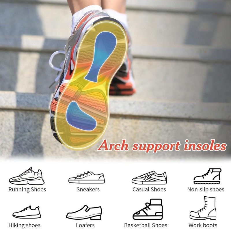 - Good breathability and sweat absorption: the plantar fasciitis pads are a breathable and anti-odor fabric specially designed for summer. The surface is equipped with fine air holes that quickly wick moisture and heat away from the feet. Thanks to the sweat-absorbing pad, the insoles for men quickly absorb sweat, keep your feet dry, inhibit bacterial growth, eliminate odours and ensure that your feet always stay fresh even in the hot summer