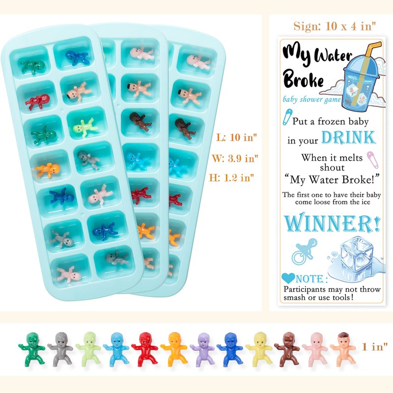 - My water broke baby shower game set: 60 mini plastic babies, 3 green ice cube trays, 1 Sign(as the picture shows). Packed in a thick cardboard box, the item will not be damaged or deformed