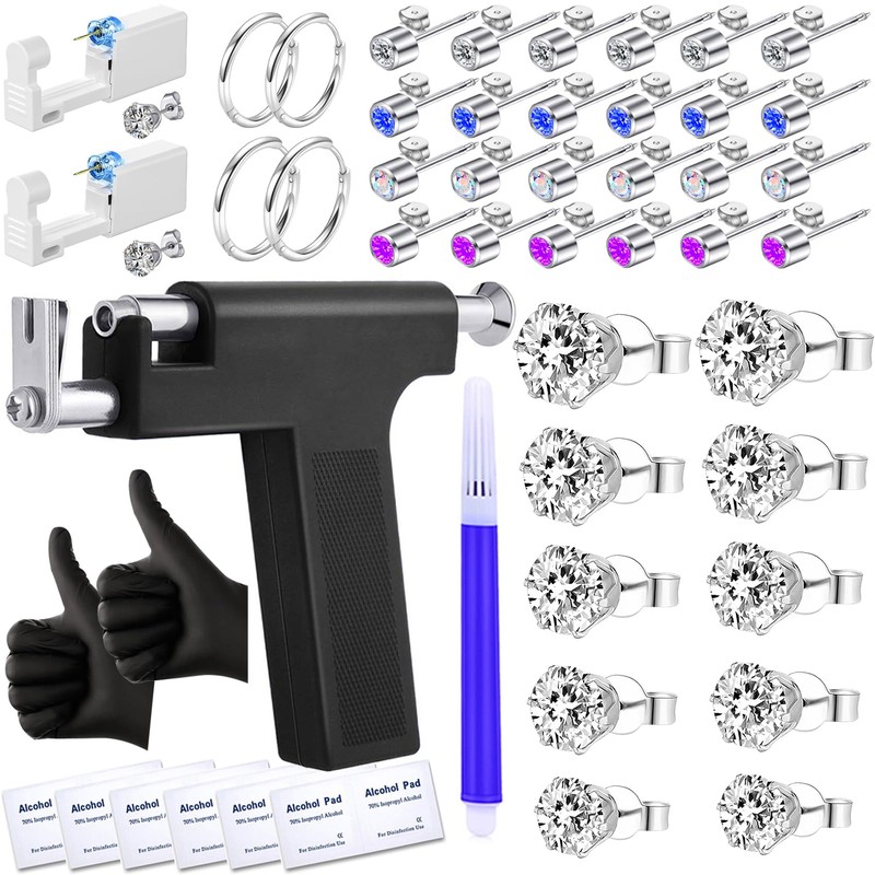 - Package Includes: You will receive 1 professional ear piercing gun, 17 pairs of cubic zirconia studs in different sizes (3/4/5/6/7mm) and colors (white, blue, rainbow, purple), 2 sets of disposable ear piercing guns (5mm diamonds), 4 pcs of hoop earrings (8mm, 10mm inner diameter), 12 cleaning pads, 1 pair of gloves, and 1 marking pen, totaling 58 pieces, including everything you need. This versatile kit allows for easy, precise, and hygienic piercings at home