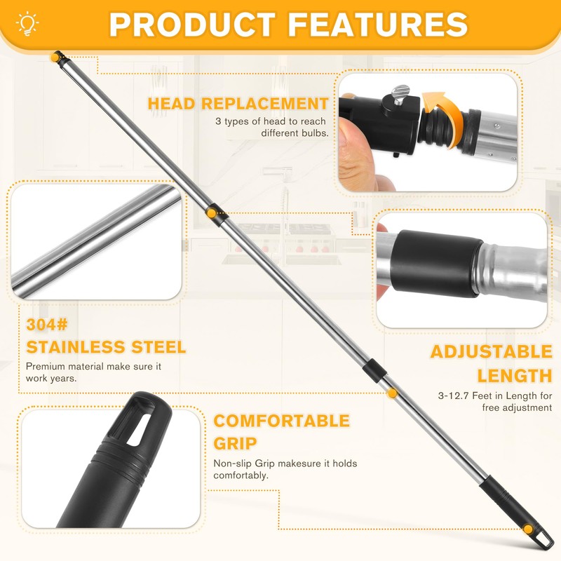 - 【Adjustable】Come with telescopic poles range from 3ft to 12.7ft to your desired length for reaching different heights of light fixtures with ease and precision.