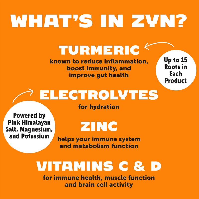 - HELPS SUPPORT YOUR IMMUNE SYSTEM: Get your daily dose of vitamin C, D, and zinc from ZYN's Turmeric drink mixes. Fortified with 100% daily value of these much-needed vitamins and minerals, it's an effective powerhouse to help boost your immune defense, while providing the perfect balance of electrolyte minerals for rapid hydration.