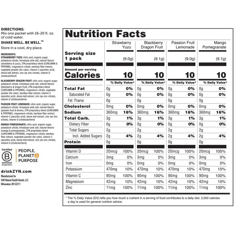 - DAILY WELLNESS DRINK MIX: Enjoy all the amaZYN flavors with this variety pack of electrolytes powder packets: Strawberry Yuzu, Mango Pomegranate, Blackberry Dragon Fruit, and Passion Fruit Lemonade. Drink it daily to recharge, refuel, rehydrate, and repair while you're on the go.