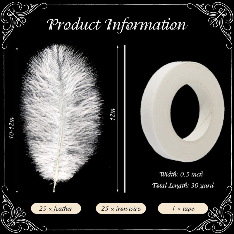 - Sufficient Pack: Included in our ostrich feathers set are 25 black feathers measuring 10-12inch in length, along with 25 pieces of 12inch iron wire and a roll of 0.5inch wide, 30 yard long tape. Everything you need is included.