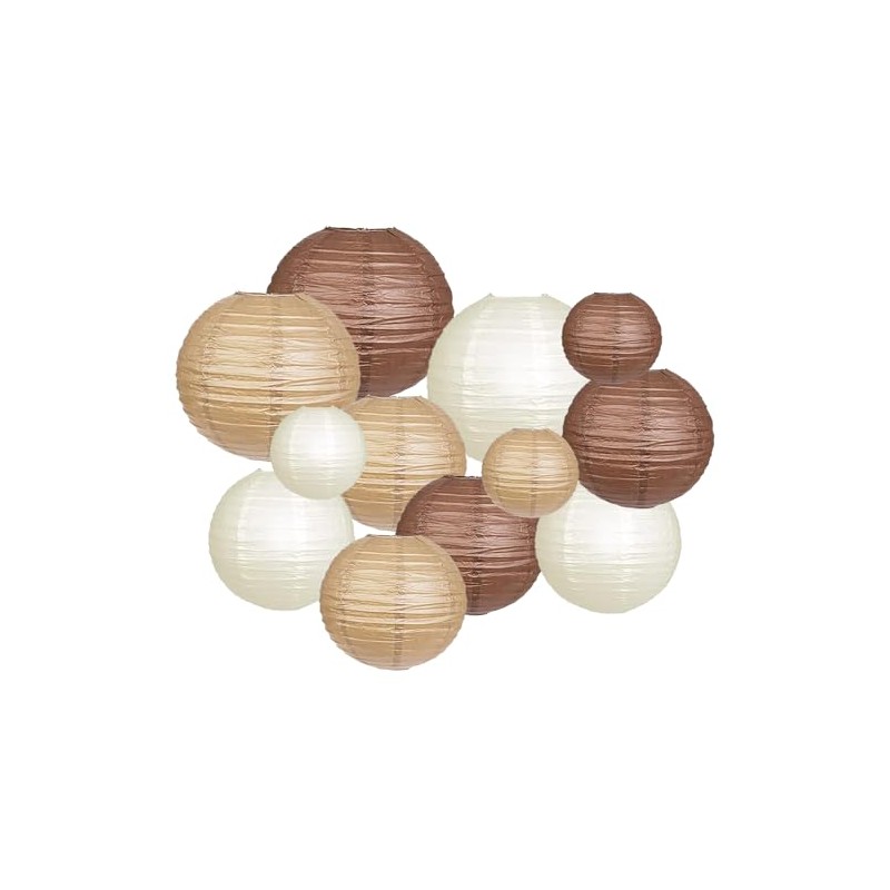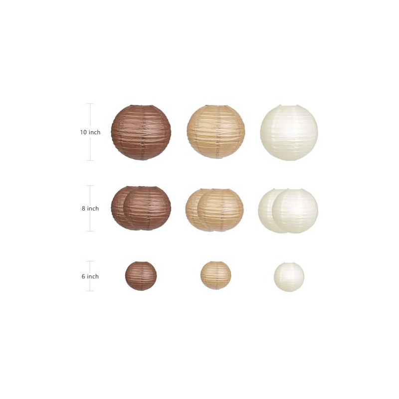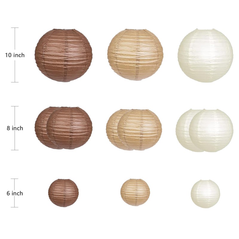 - Paper lantern decorations – package includes: 3 x 25 cm, 6 x 20 cm and 3 x 15 cm paper lantern brown and ivory.