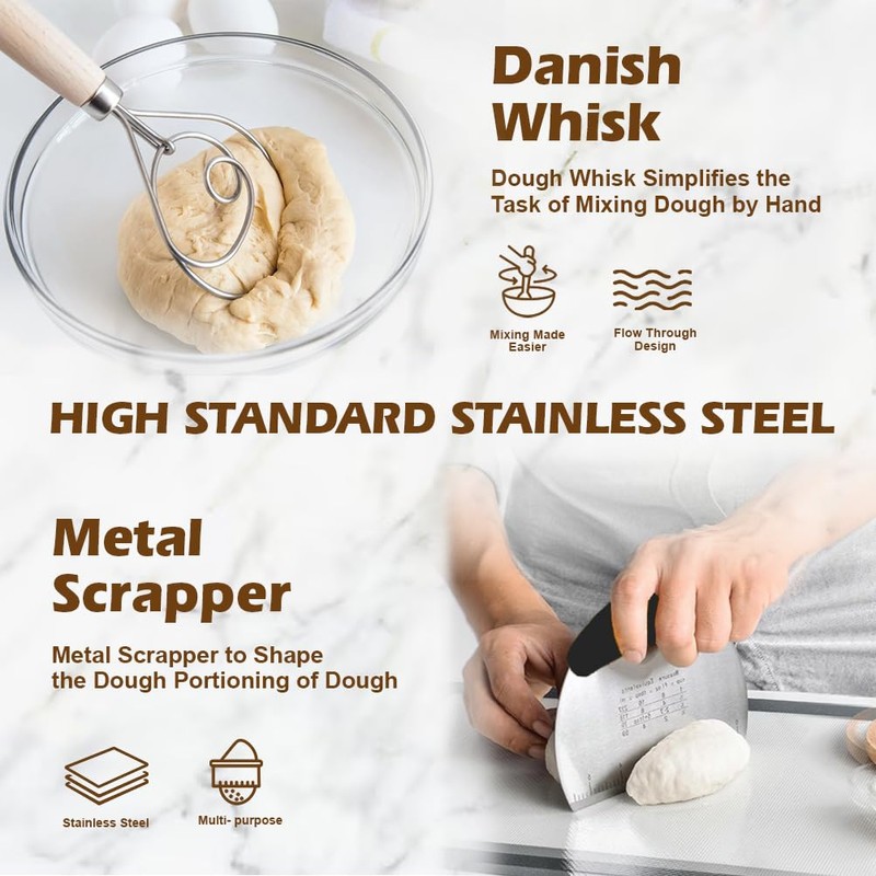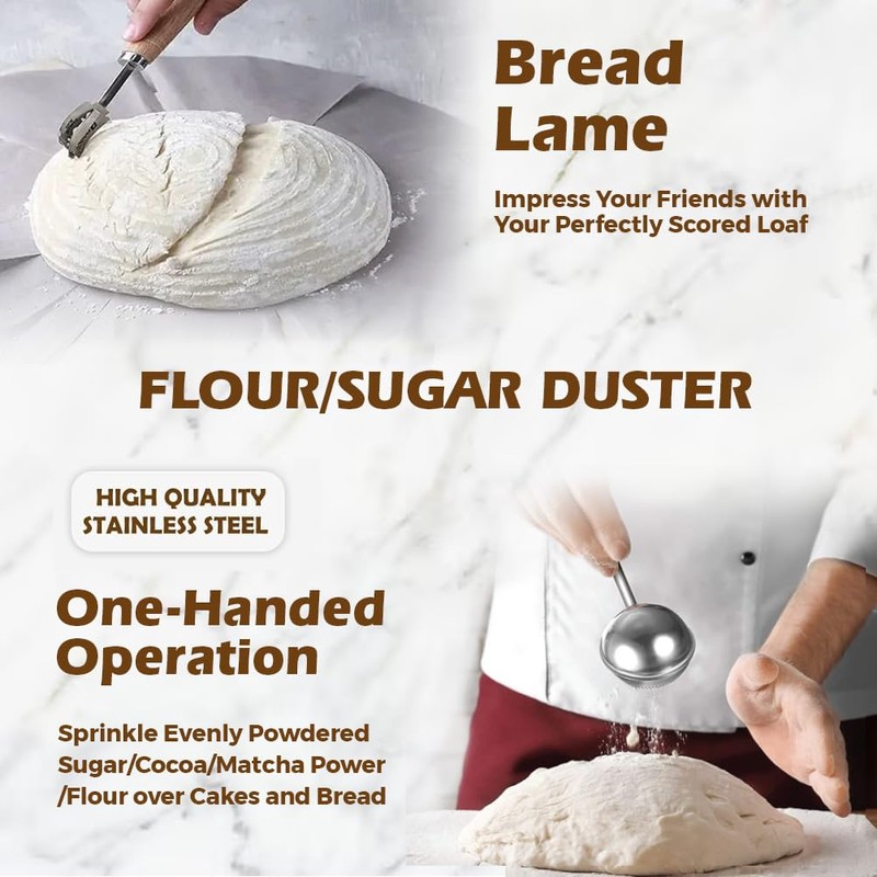 - ZYROXY BAKING KIT 🌭 : The All-Inclusive Kit offers essential baking tools, a versatile dough scraper, dough whisk, a bread bag for freshness, a silicone brush for glazing, and a flour sifter for sifting. The proofing basket ensures ideal dough rising, while the bread lame allows intricate scoring. A cloth liner completes this set, perfect for any baking enthusiast.