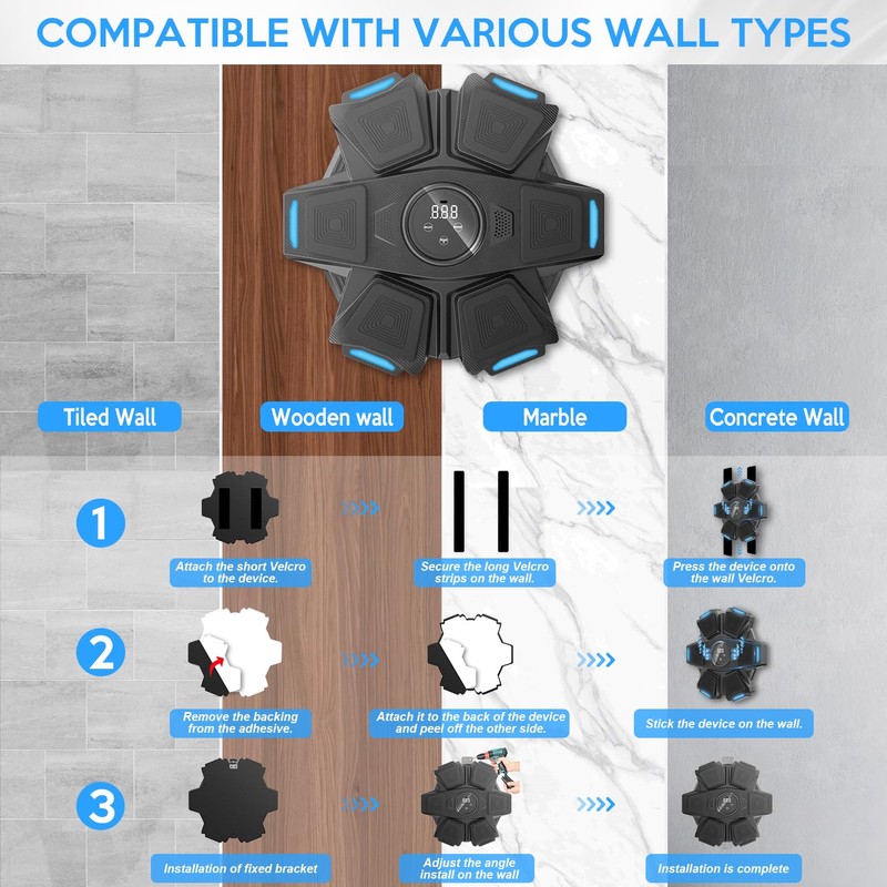 Maximize your home workout space with this boxing wall mount machine. The punching music boxing machine is easy to install using strong Velcro or double-sided tape, with no drilling required. This hassle-free setup allows you to enjoy a full boxing music workout at home, anytime. It's the perfect addition to your home gym or office space.