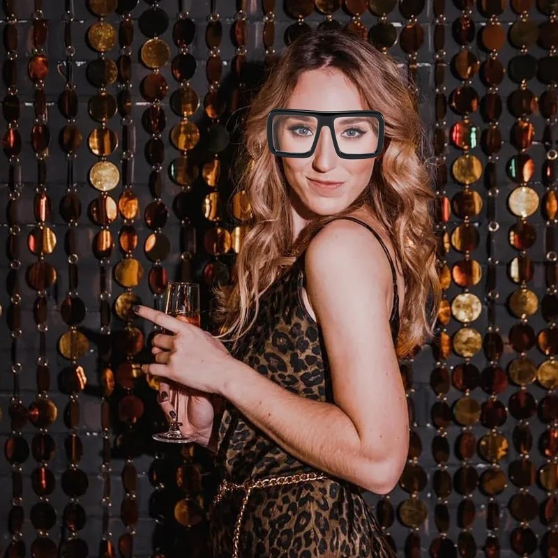 - Design: oversized square glasses frame in glossy black with clear lenses for a striking nerd look