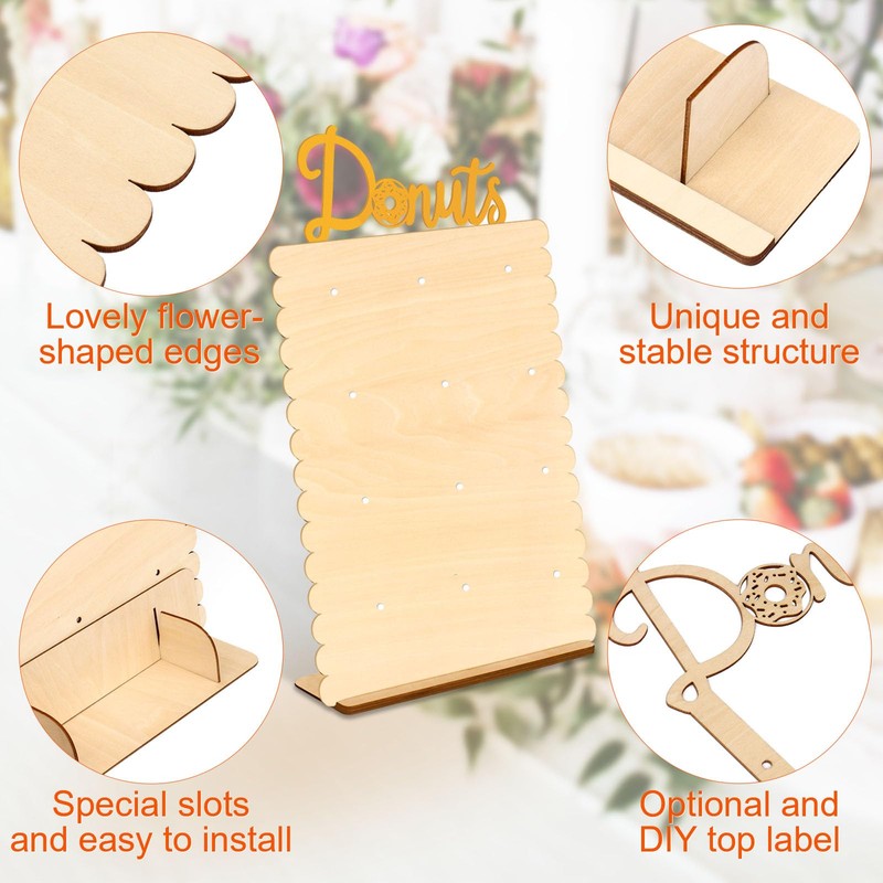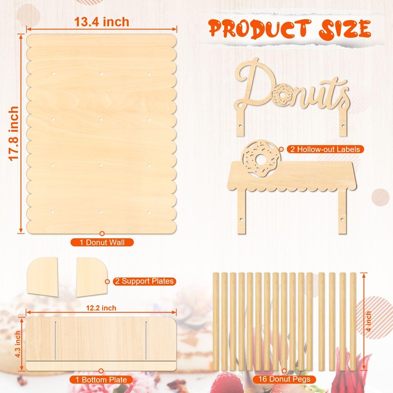- Easy to use: The package includes 1 donut wall (17.8 x 13.4 in), 2 support plates (3 x 2.4 in), a bottom plate (12.2 x 4.3 in), 2 hollow-out labels (9.7 x 7 in), 16 donut pegs (4in long), it is really convenient to install them. Then you can add some fresh flowers to decorate it and make it more decorative. Now, you can put on the delicious and good-looking donuts you made.