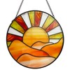 - Design:This stained glass window hanging features a sunrise design with gradient orange-yellow hues and mountain silhouettes. The sun catchers sunrise pattern hanging casts vibrant light patterns, perfect for modern, minimalist interiors or sunlit patios